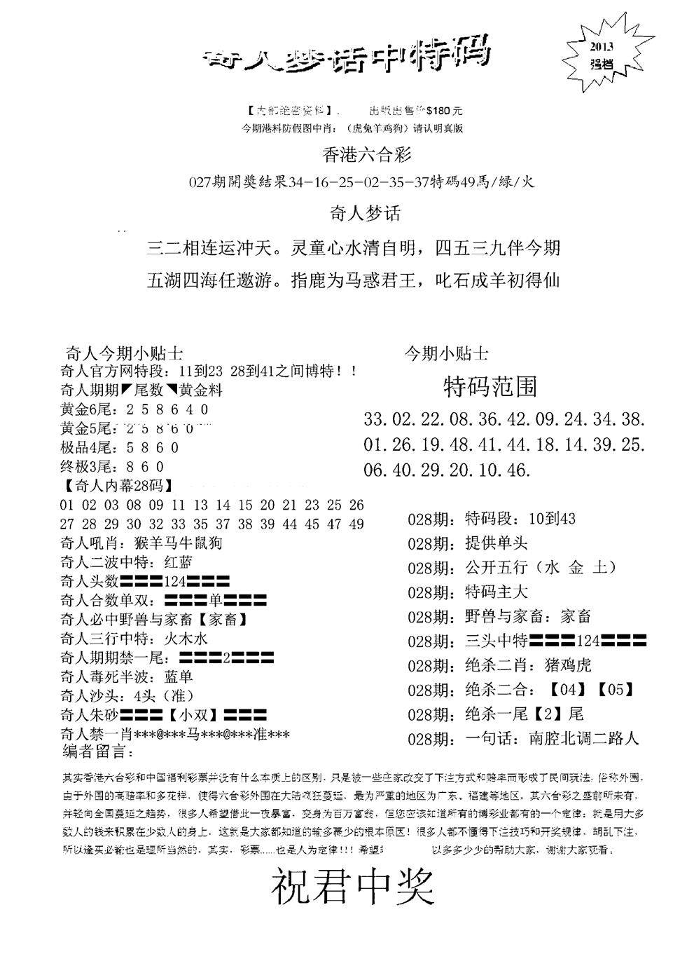 奇人梦话中特码